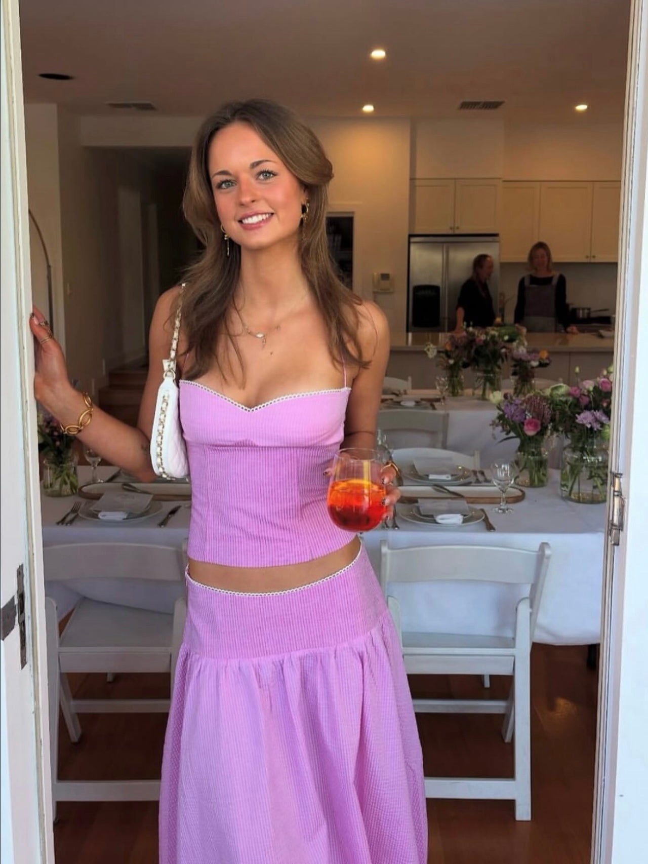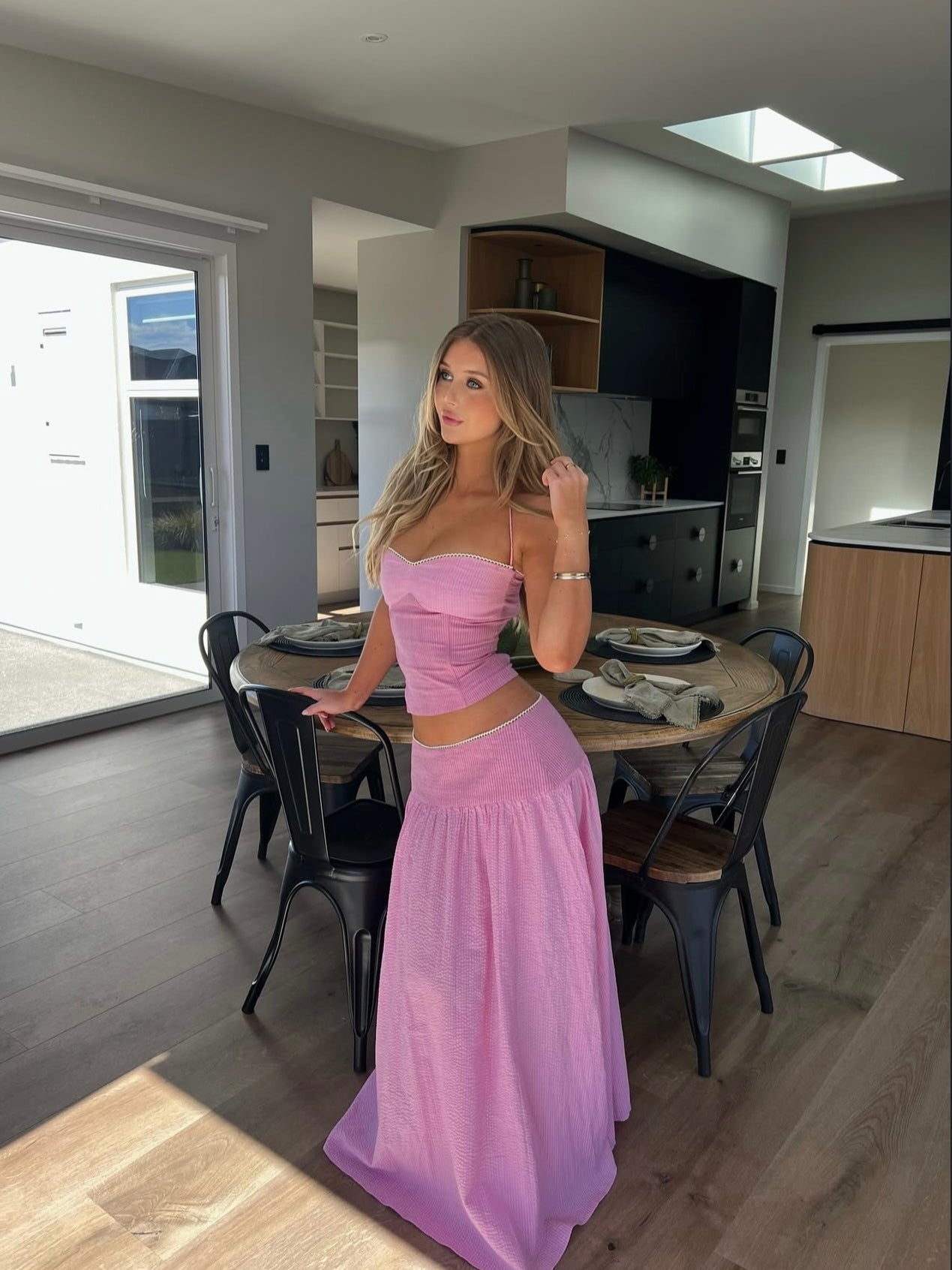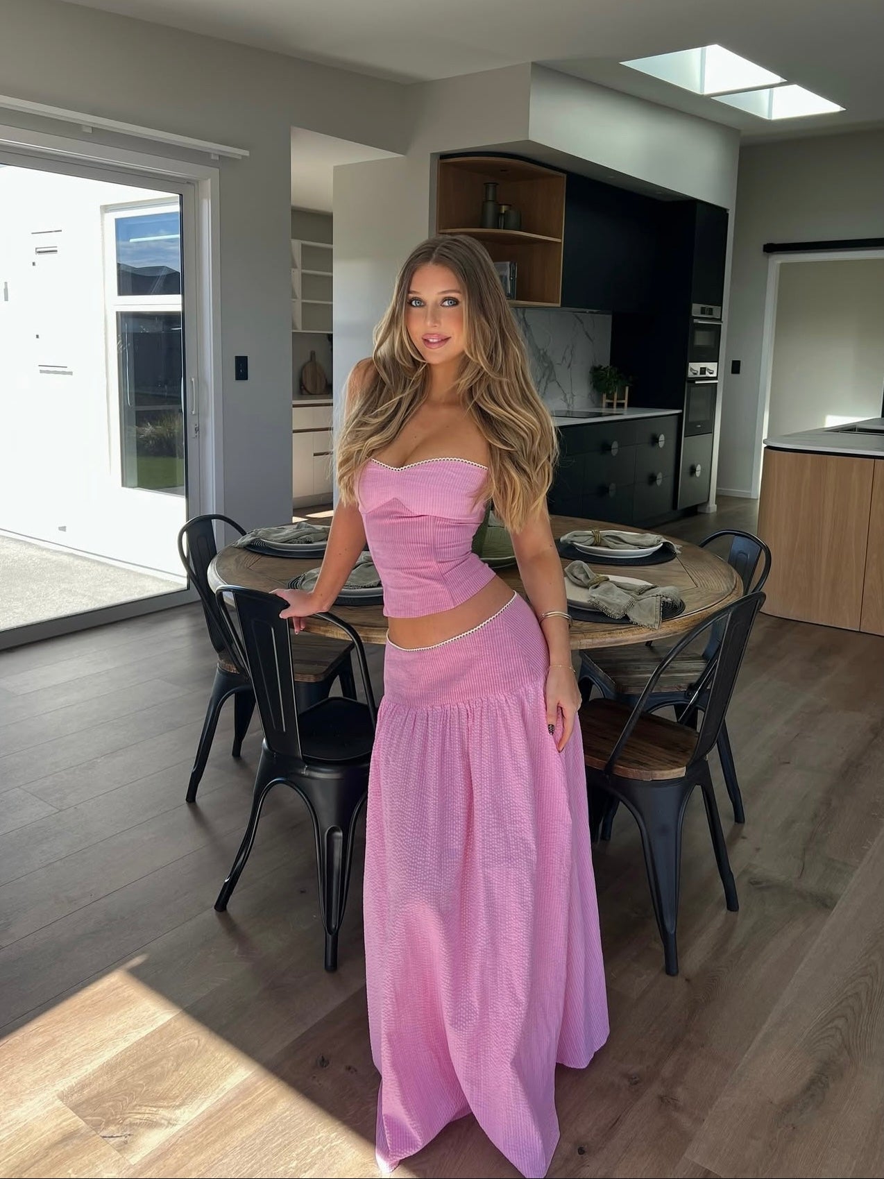Fully boned corset Halter neck ties Back lace-up closure Sweetheart neckline Fully double lined No stretch Low waist maxi skirt Wide hem