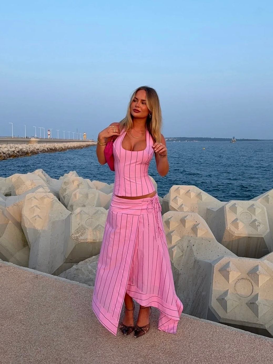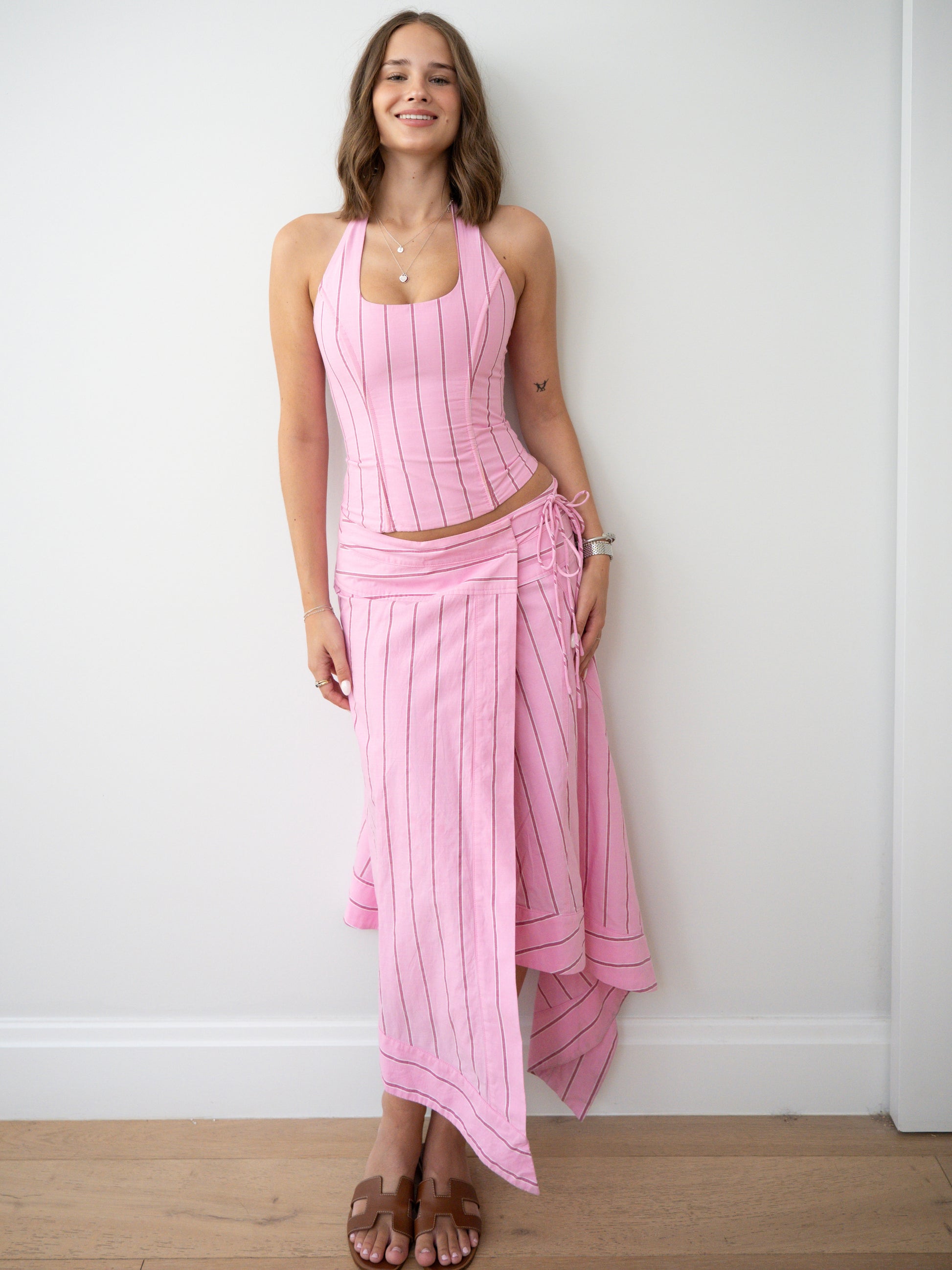 Fully boned corset Thick halter neck straps Back lace-up closure Low waist wrap skirt Wrap design with invisible double button and tie closure Wide hem Fully double lined No stretch